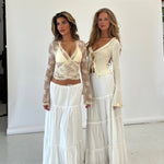 Beautiful lace wrap top with plenty of stretch, designed to fit the body nicely. The top features long sleeves and a deep neckline.