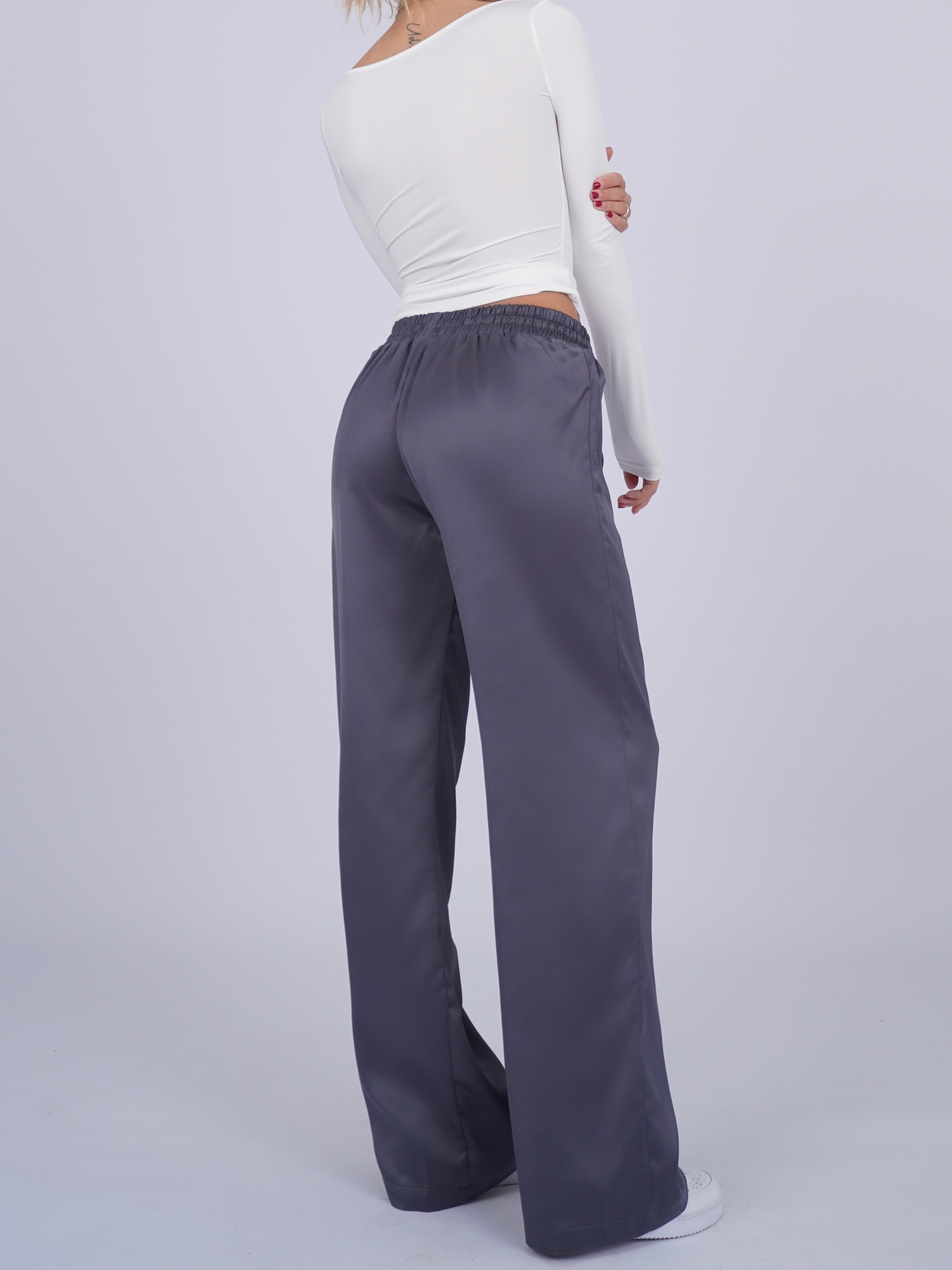 Introducing these sleek dark grey satin pants that sit slightly high on the waist and provide a comfortable stretch. The soft and draping material has a shimmering effect in the light and lacks pockets for a streamlined look.