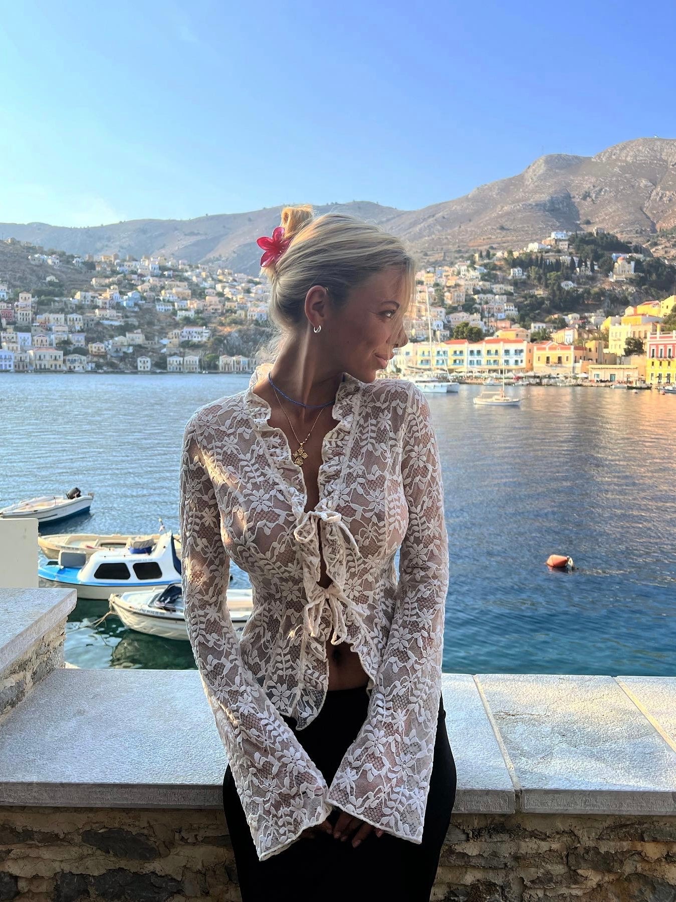 Beautiful lace top with ties and long sleeves. The top is tied in two places and can therefore be tightened as desired.