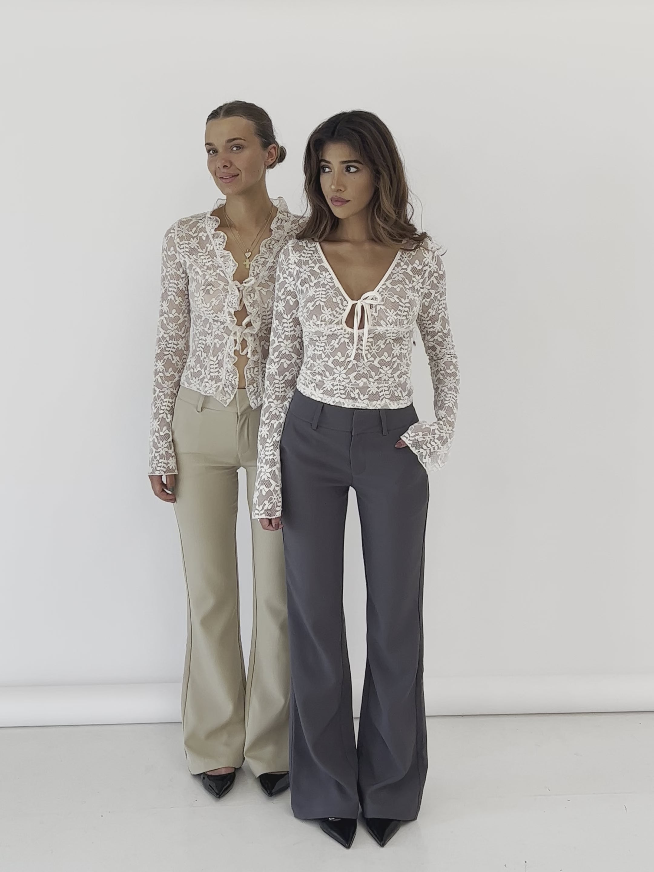 Flared suit trousers in dark grey, which are slightly high-waisted. The trousers have belt straps and a wide waistband, which gives an incredibly nice look and fit. The trousers are made of soft material with a little stretch, which is really comfortable and fits the body very well.