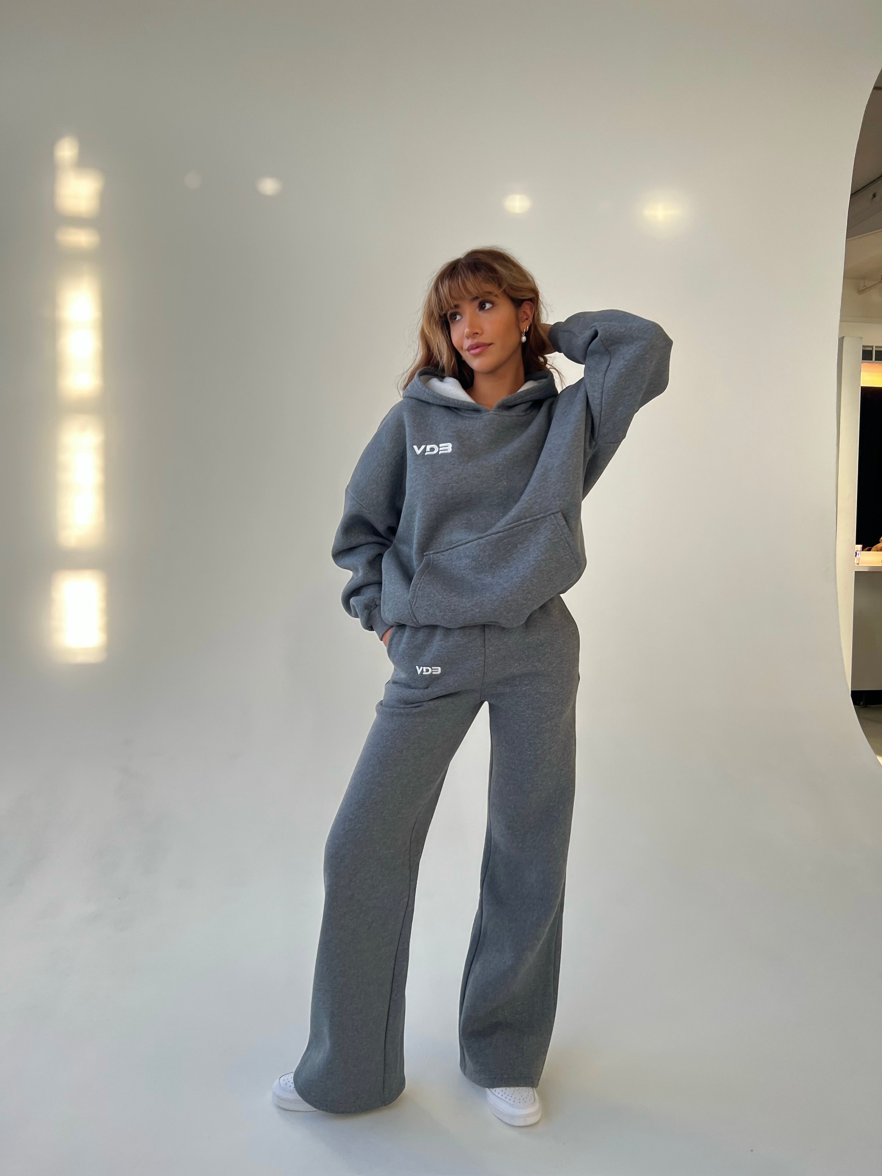 Sweatpants in the most comfy material. The trousers have fleece on the inside and are so soft to wear. There is a small logo embroidered “VDB” on it, and there are pockets in the trousers. The trousers have elastic at the waist and loose at the ankles.