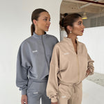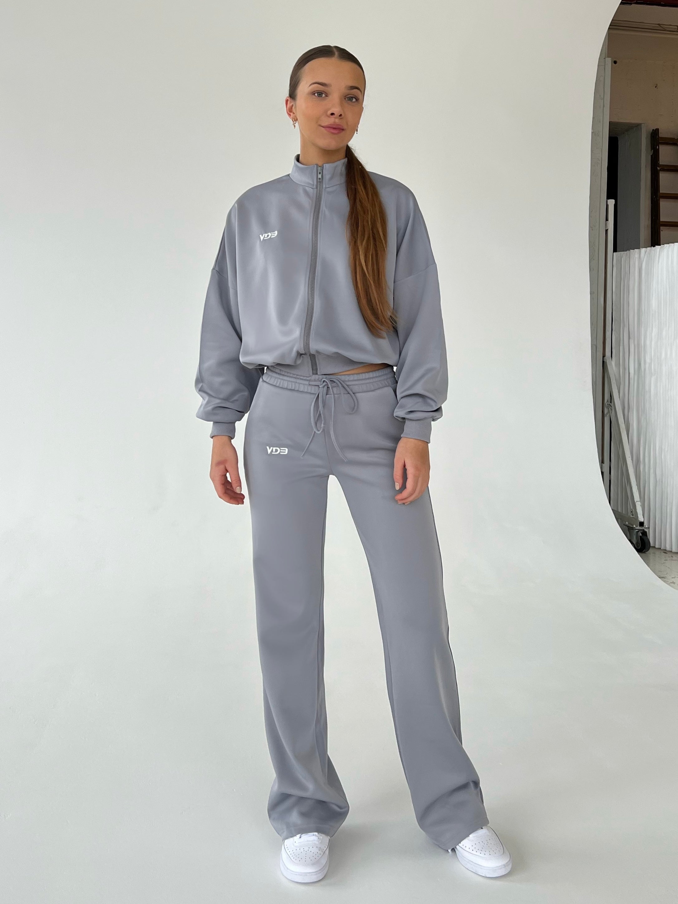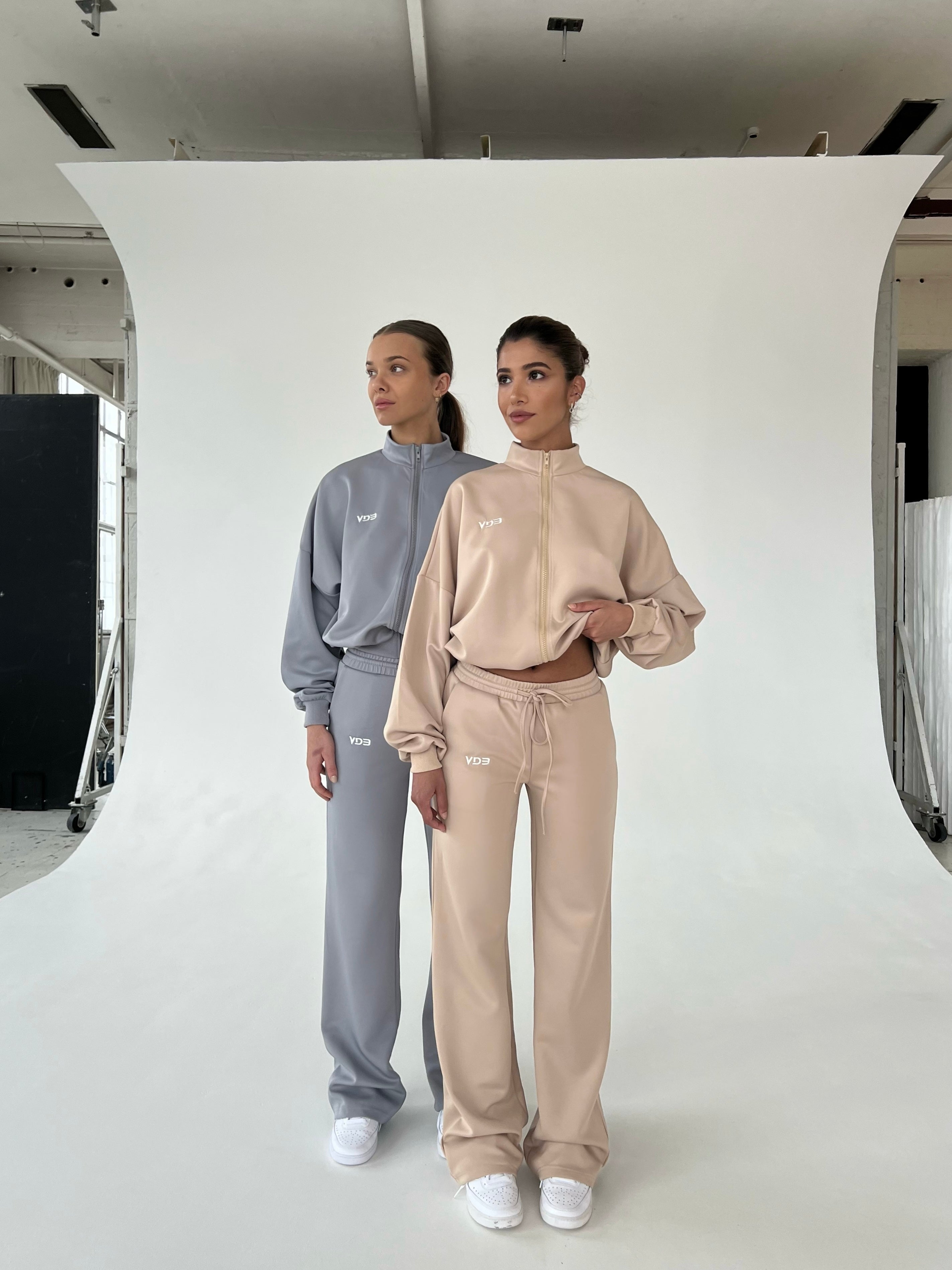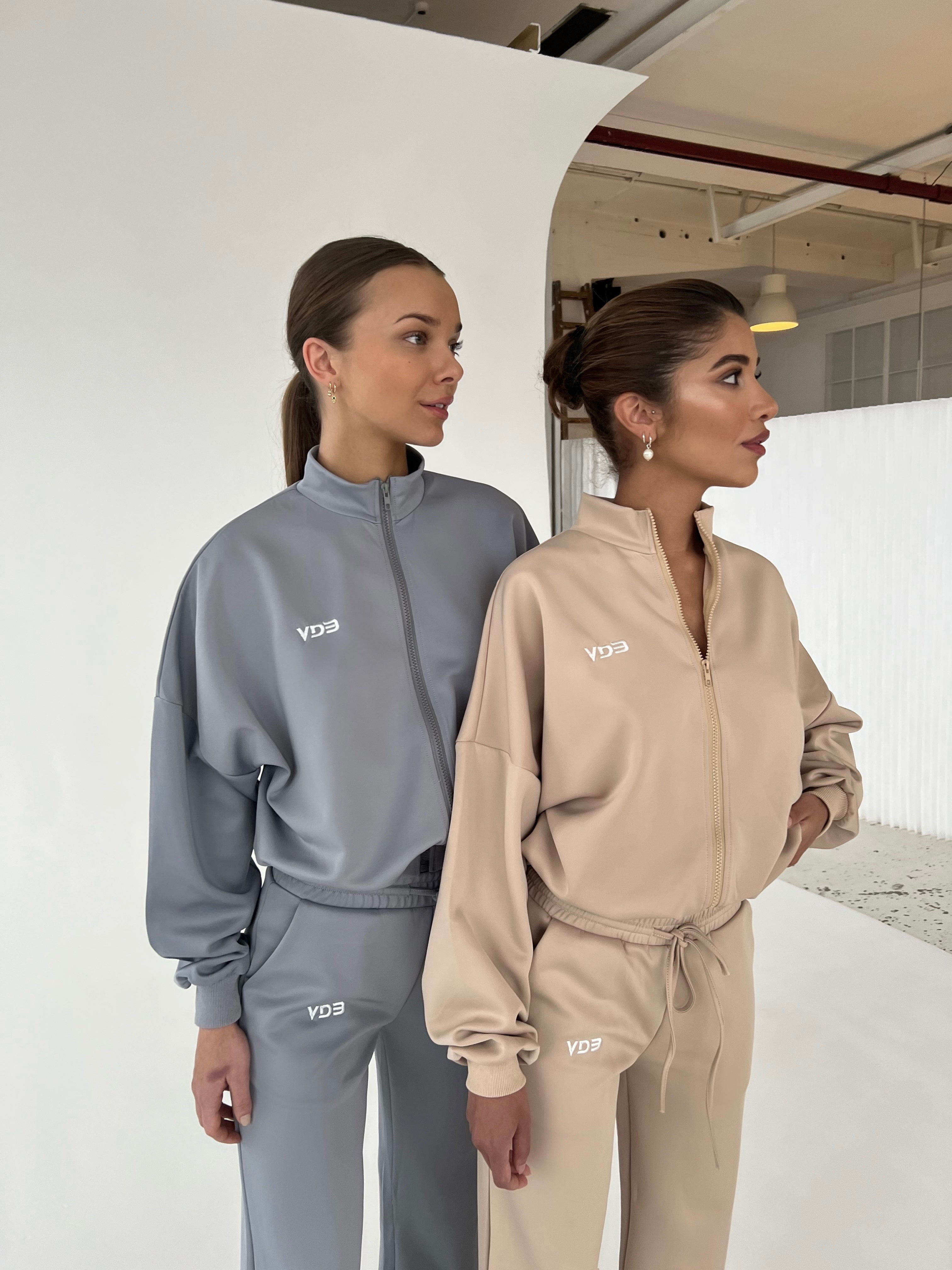 Jacket in soft comfy material. The jacket has a zip all the way down the front. VDB is embroidered on the front. There is stretch in the material.