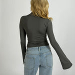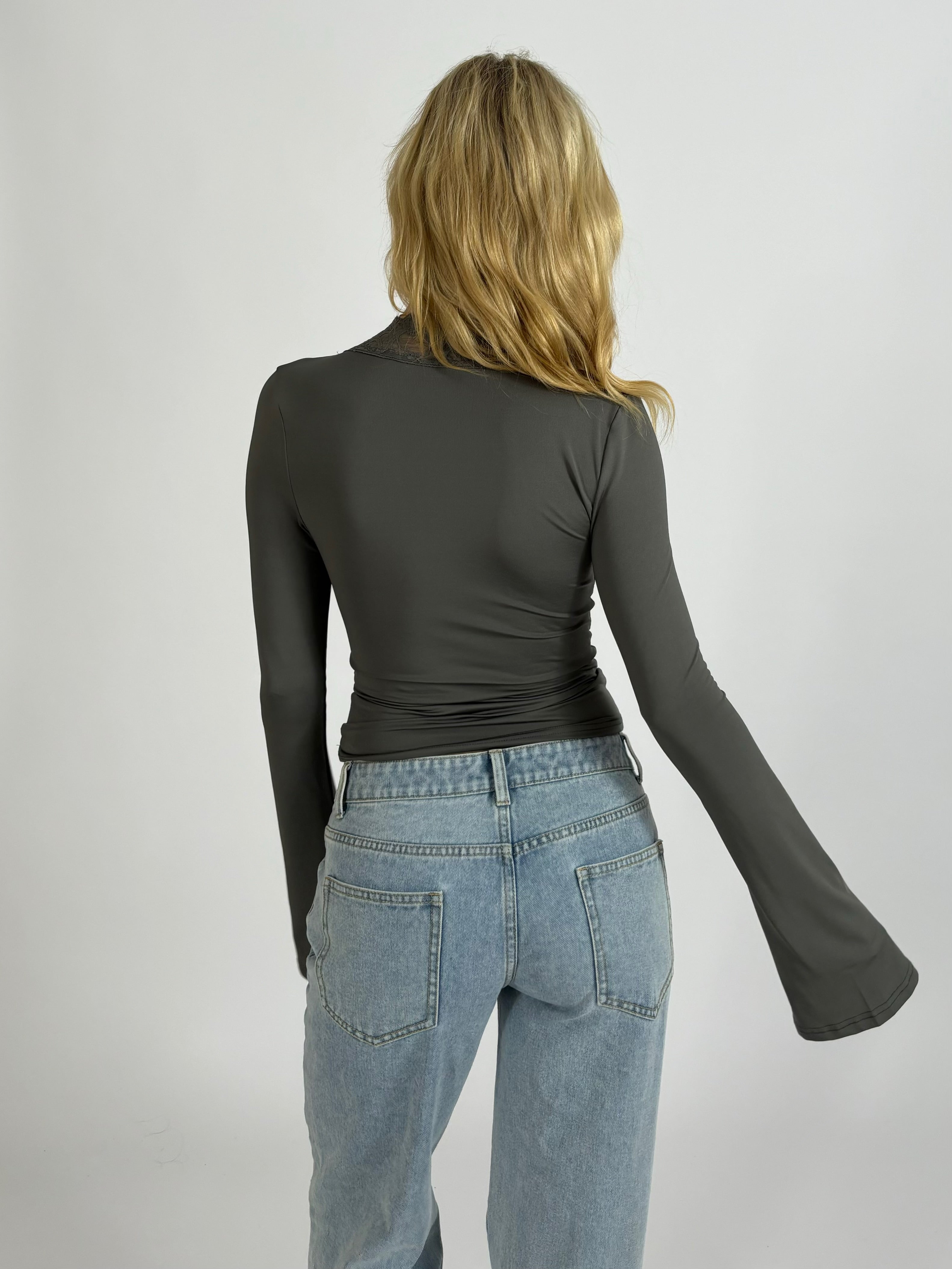 Beautiful top with a lace trim, made from a very stretchy material that fits the body beautifully. The top features long sleeves and a deep neckline.