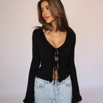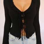 Beautiful ruffle blouse made from the softest knit material with wool. The blouse is stretchy and fits beautifully to the body. It features long sleeves and a deep neckline, with adjustable ties.